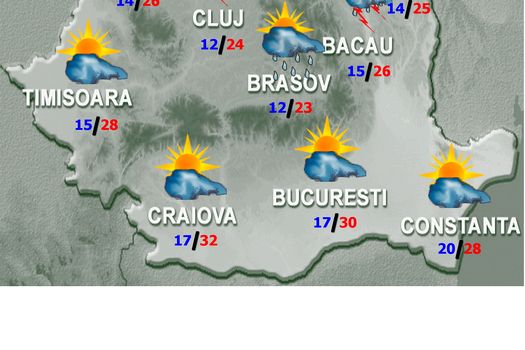 Temperaturile maxime se vor situa intre 20 de grade in estul Transilvaniei si 34 de grade in sudul Olteniei, iar cele minime vor fi cuprinse intre 8 si 21 de grade. Spre sfarsitul intervalului, in depresiuni vor fi conditii de ceată.