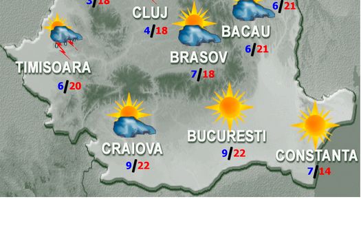 Izolat se vor acumula cantităţi de apă de peste 10…15 l/mp şi vor fi condiţii de grindină. În restul teritoriului, în cursul zilei, vremea va fi frumoasă, cu cerul mai mult senin, dar noaptea vor fi înnorări şi ploi sub formă de aversă, local în est şi izolat în sud. În a doua parte a intervalului, la munte, la altitudini de peste 1400 m, izolat şi trecător, precipitaţiile vor fi şi sub formă de lapoviţă şi ninsoare. Vântul va sufla slab şi moderat, cu intensificări locale şi temporare în majoritatea zonelor. Temperaturile maxime, mai ridicate decât în mod obişnuit la această dată, vor avea valori de la 11 grade pe litoral, până la 23 de grade în Lunca Dunării, iar cele minime se vor încadra, în general, între 2 şi 8 grade.