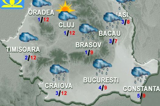Vremea va fi normală sub aspect termic, se vor înregistra temperaturi maxime cuprinse între 6 şi 15 grade şi minime între -3 şi 5 grade. Cerul va fi variabil în regiunile vestice, iar în rest va avea înnorări temporar accentuate, îndeosebi în Moldova, unde vor predomina ploile, precum şi în Dobrogea şi Muntenia unde local va mai ploua slab.