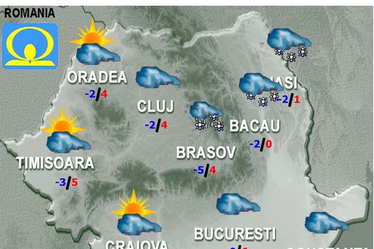 Vremea se va ameliora sub aspectul precipitaţiilor, dar cerul se va menţine mai mult noros. Vântul va sufla slab până la moderat. Temperatura maximă va fi de 5…6 grade, iar cea minimă de -2…0 grade.