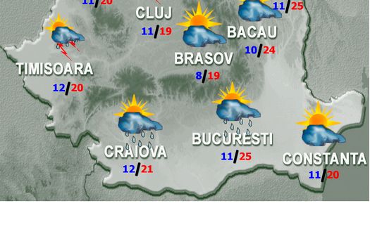 Vor fi înnorări temporar accentuate şi se vor semnala averse şi descărcări electrice, în cea mai mare parte a ţării. Ploile vor avea şi caracter torenţial şi îndeosebi la deal, la munte, în Oltenia, Transilvania şi Muntenia, cantităţile de apă vor depăşi local 15…20 l/mp şi izolat 30…40 l/mp. Pe arii restrânse va cădea grindină. Vântul va sufla slab şi moderat, cu unele intensificări mai ales în timpul averselor, când poate lua aspect de vijelie. Excepţie vor face regiunile sud-estice, unde cerul va avea înnorări trecătoare, iar manifestări specifice instabilităţii atmosferice vor fi pe arii mai restrânse. Temperaturile maxime vor fi cuprinse între 17 şi 27 de grade, iar cele minime între 6 şi 14 grade.