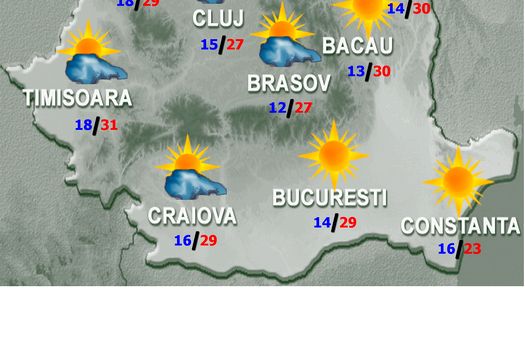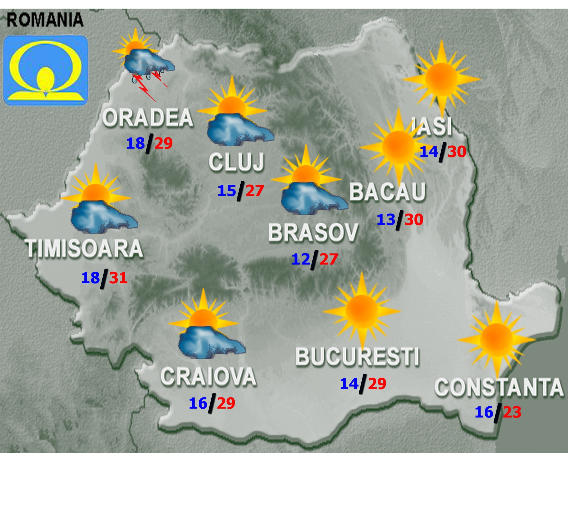 Vremea va fi în general instabilă. Instabilitatea atmosferică se va manifesta prin înnorări, temporar accentuate, averse şi cu caracter torenţial, descărcări electrice, intensificări de scurtă durată ale vântului în sud-vestul, centrul, nordul şi nord-estul ţării, la deal şi la munte, iar spre seară şi noaptea şi în sud. Excepţie vor face regiunile vestice şi de sud-est, unde astfel de fenomene se vor semnala pe arii restrânse. Pe spaţii mici, trecător vor fi vijelii, căderi de grindină şi cantităţi de apă mai mari de 25-30 l/mp. Din punct de vedere termic, vremea se va răcori în vest, în nord şi în centru, iar în restul teritoriului şi mai cu seamă în sud-est, se va menţine călduroasă. La nivelul întregii ţări, temperatura aerului va avea valori – maxime cuprinse între 23 şi 33 de grade şi minime între 12 şi 20 de grade.