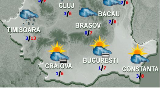 Cerul va avea înnorări ce vor persista în vestul, nordul şi centrul ţării, unde temporar va ploua. Ploile vor fi mai frecvente şi mai însemnate cantitativ în Maramureş şi în nordul Transilvaniei, unde se vor acumula local 15…20 l/mp şi izolat peste 35 l/mp. În zona Carpaţilor Orientali, la peste 1800 m vor fi ninsori, se va depune strat consistent de zăpadă, iar vântul va prezenta intensificări cu rafale de peste 70 km/h. În Moldova şi în restul zonei de munte vor fi precipitaţii mixte şi pe arii restrânse se va produce polei. Mai ales dimineaţa, local în zonele joase de relief din sudul şi din estul ţării va fi ceaţă şi cu totul izolat ploi slabe sau burniţe. Vântul va sufla slab şi moderat, cu unele intensificări la munte, dar local şi în vestul şi sud-estul teritoriului. Temperaturile maxime se vor încadra între 1…2 grade în sudul extrem al Olteniei şi sud-vestul Munteniei şi în jurul a 14 grade în Banat şi Subcarpaţii de Curbură, iar cele minime vor fi cuprinse, în general, între -2 şi 5 grade.