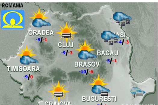 Valorile termice se vor menţine mai coborâte decât în mod normal la această dată în regiunile sudice şi sud-estice, dar se vor apropia de mediile climatologice în restul teritoriului. Ger va mai fi dimineaţa local în vestul, nord-vestul, centrul şi sudul ţării, iar noaptea pe arii mai restrânse. Cerul va fi variabil, cu înnorări mai persistente în est şi în sud-est, unde trecător şi izolat, ziua, va ninge slab. Va fi ceaţă asociată cu chiciură, dimineaţa pe arii restrânse, iar noaptea în zonele joase din sud, centru şi est şi doar izolat, posibil în rest. Vântul va sufla slab şi moderat, cu unele intensificări în sudul Banatului. Temperaturile maxime se vor încadra între -4 şi 6 grade, cu cele mai ridicate valori în vest, iar cele minime se vor situa între -17 grade în depresiuni şi -1 grad în Dealurile de Vest.
