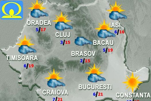 În nordul, nord-vestul şi centrul ţării, valorile termice vor fi apropiate de cele climatologic specifice perioadei, cerul va fi temporar noros şi pe arii restrânse va ploua slab. La munte, la peste 1800 m altitudine, vor fi precipitaţii mixte. În restul ţării vremea va fi predominant frumoasă şi mai caldă decât în mod obişnuit la această dată, iar cerul va fi variabil, cu unele înnorări spre seara în sud-est unde ploile vor fi posibile cu totul izolat. Vântul va sufla slab şi moderat, cu intensificări temporare în majoritatea zonelor, dar mai ales la munte. Temperaturile maxime se vor încadra între 13 şi 22 de grade, iar cele minime între 2 şi 10 grade, mai coborâte în depresiuni, spre -1 grad.