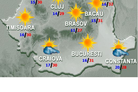Vremea va fi frumoasă şi caldă. Cerul va fi mai mult senin, iar vântul va sufla în general moderat. Temperatura maximă va fi de 31…32 de grade, iar cea minimă de 15…17 grade.
