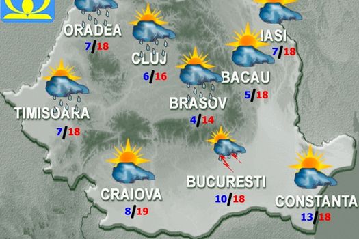 Vremea se va menţine răcoroasă în cea mai mare parte a ţării, chiar rece pentru această dată în nord, în centru şi în nord-est, unde cerul va avea înnorări pe parcursul zilei şi pe arii relativ extinse vor fi ploi, mai ales averse, însoţite şi de descărcări electrice. În cursul după-amiezii, fenomene asociate instabilităţii atmosferice vor apărea local şi în regiunile sud-estice şi în zonele montane şi submontane. Izolat cantităţile de apă vor depăşi 15…20 l/mp şi vor fi condiţii de grindină. Pe crestele montane înalte, trecător, precipitaţiile vor fi şi sub formă de lapoviţă sau ninsoare. Temperaturile maxime se vor încadra între 12…13 grade în estul Transilvaniei şi nordul Moldovei şi 22 de grade în sudul Munteniei şi al Olteniei; minimele termice vor fi cuprinse între 3 şi 11 grade, mai scăzute în depresiunile intramontane, spre 0 grade.