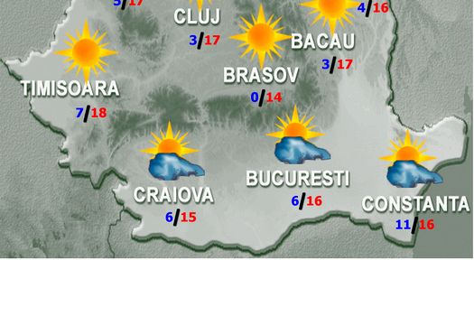 Vremea va fi răcoroasă, pentru această perioadă din an, în vestul şi nord-vestul ţării şi rece, în celelalte regiuni. Cerul va fi parţial noros în sud şi sud-est şi mai mult senin în restul teritoriului. Vântul va mai avea intensificări, în special în cursul zilei, în Dobrogea, cu viteze mai mari pe litoral şi în deltă. Temperaturile maxime se vor încadra între 13 şi 19 grade, iar cele minime între 1 şi 12 grade, mai coborâte în estul Transilvaniei, până în jurul a -3 grade. Izolat, mai ales în depresiunile din nord şi din centru, se va produce brumă. În a doua parte a nopţii, pe arii restrânse, în zonele joase de relief, se va forma ceaţă.