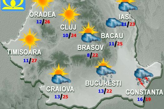 Vremea va fi în general frumoasă în cursul zilei, cu cer variabil şi ploi de scurtă durată în special în zonele de munte. Începând cu orele serii instabilitatea atmosferică se va accentua şi vor fi înnorări, averse, descărcări electrice şi intensificări de scurtă durată ale vântului în Maramureş, cea mai mare parte a Transilvaniei şi Moldovei, precum şi la munte şi pe arii restrânse în celelalte regiuni. Vor fi condiţii de grindină, iar izolat cantităţile de apă vor fi însemnate. Temperaturile maxime, mai ridicate decât în ziua precedentă, vor fi cuprinse între 22…23 de grade în estul Transilvaniei şi 30 de grade, izolat în Oltenia, iar cele minime se vor situa, între 9 şi 18 grade. Dimineaţa, izolat vor fi condiţii de ceaţă.