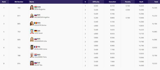 Mai întâi, Denisa a cucerit medalia de bronz în finala de sărituri. Sportiva antrenată de Nicolae Forminte a avut un total de 14.166 (14.500 + 13.833), fiind întrecută de Boglarka Devai (Ungaria / 14.349) şi de Angelina Melnikova (Rusia / 14.233).