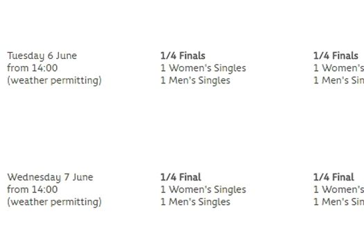 Conform programului oficial al turneului, dat publicităţii încă dinaintea începerii competiţiei de la Paris, ultimele două sferturi de finală de pe tabloul feminin sunt programate miercuri, 7 iunie, începând cu ora 15:00, pe arenele Philippe Chatrier, respectiv Suzanne Lenglen, singurele modificări putând să apară în funcţie de starea vremii.