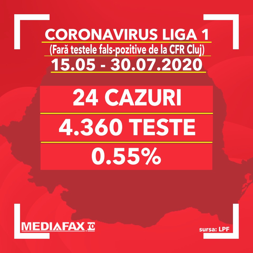 Au existat însă şi teste fals-pozitive. CFR Cluj a anunţat pe data de 28 iulie că testele a 23 dintre jucători, făcute la o clinică din Bucureşti, au fost eronate. Ceea ce înseamnă că numărul total de cazuri din Liga 1 a fost de doar 24, iar rata de infectare reală din fotbal este de 0.55%.