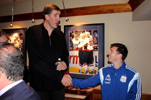 Mureşan, singurul român care a jucat în NBA şi care are o înălţime de 2,31 metri, apare într-o fotografie în care dă mâna cu Lionel Messi, jucător de 1.69 metri.