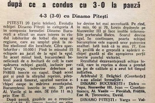 „Acum câteva zile, dinamoviştii s-au adunat în holul clubului lor din şos. Ştefan cel Mare, pentru a sta de vorbă despre ce a fost, ce este şi ce va fi. Conducătorii, antrenorii şi jucătorii au conferit acestei seri caracterul unei dezbateri de lucru, stimulând schimbul de păreri”, scria Ioan Chirilă, în stilul vremii, despre o şedinţă ţinută la clubul Dinamo pe 6 ianuarie 1964, notează ProSport.