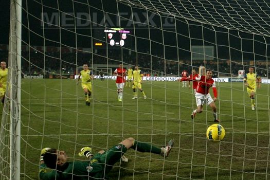 1-0: Marius Niculae a transformat cu noroc penaltiul acordat de Cristian Balaj pentru un henţ comis în careu de Iliev, mingea revenind din bară în spatele portarului Tătăruşanu şi intrând apoi în poartă.