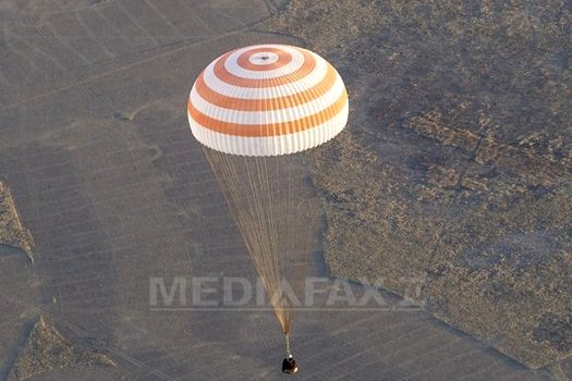 Ei au aterizat într-o capsulă Soyuz suspendată de o paraşută albă mare în regiunea Djezkazgan, în stepele Kazahstanului, pe o vreme favorabilă dar rece, potrivit imaginilor difuzate de televiziunea rusă.