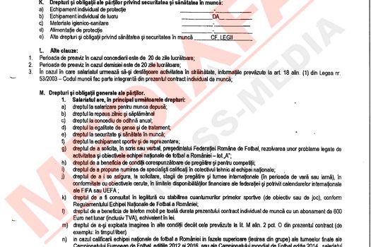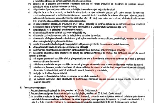 Conform unei clauze din contract, partea care solicită închierea înţelegerii înainte de termenul de 30 noiembrie 2016 (la cinci luni după Euro-2016) trebuie să plătească despăgubiri, după cum urmează: „Dacă până la data de 30 noiembrie 2016, oricare dintre părţi denunţă unilateral contractul, aceasta (angajator sau salariat) va achita toate sumele prevăzute la punctele J1 (n.r. – 10.000 de lei brut pe lună) şi J2 (n.r. – 400.000 de euro net anual), litera a), ce ar fi fost scadente de la momentul denunţării unilaterale a contractului şi până la 30.11.2016, precum şi, în plus, o despăgubire în sumă de 500.000 de euro net, plătibilă în 45 de zile de la data denunţării unilaterale a contractului”.