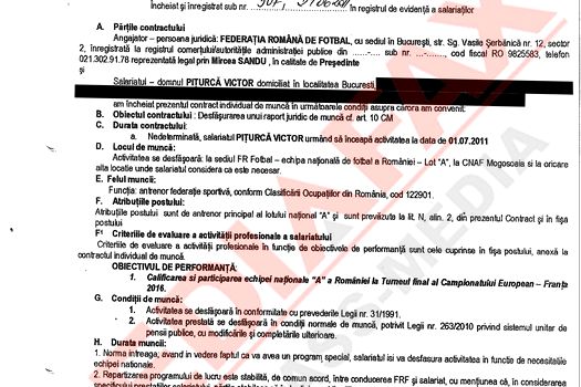 Potrivit contractului, obiectivul de performanţă este calificarea şi participarea echipei naţionale a României la turneul final al Campionatului European – Franţa 2016. Dacă reuşeşte această performanţă, Piţurcă ar urma să încaseze un premiu de 350.000 de euro net, după ce UEFA va vira către FRF drepturile financiare corespunzătoare calificării. În cazul în care echipa naţională trece de faza grupelor la Euro 2016, Piţurcă îşi va putea negocia drepturile financiare aferente acestei calificări.