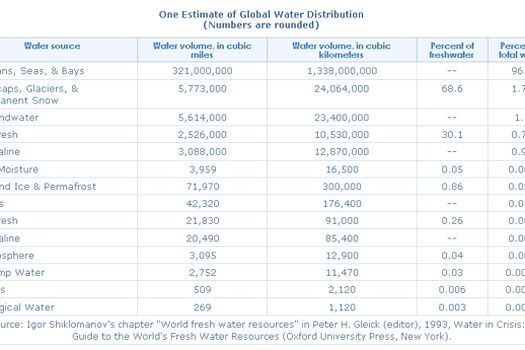 Apa, de asemenea, există în aer sub formă de vapori de apă, în lacuri şi răuri, în calotele polare şi în gheţari, şi în creaturile vii, dar toată această apă ar încăpea în acea bulă mică.