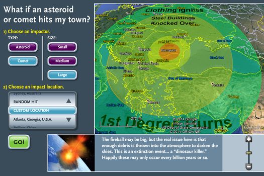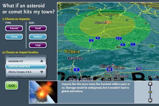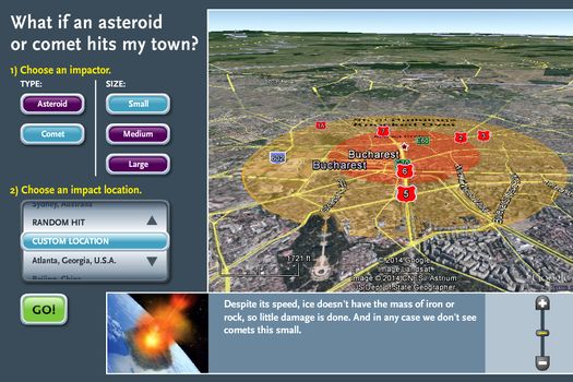 Cu ajutorul unui plugin Google Earth, aplicaţia le oferă posibilitatea utilizatorilor să aleagă tipul proiectilului (asteroid sau cometă) şi mărimea acestuia: mică, medie sau mare.