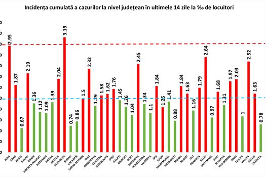 Între 1,5 şi 2 la mia de locuitori este coeficientul de infectare în judeţele Arad – 1,87, Caraş-Severin – 1,5, Covasna – 1,58, Dâmboviţa – 1,62, Dolj – 1,76, Iaşi – 1,84, Mureş – 1,84, Neamţ – 1,63, Prahova – 1,79, Sibiu – 1,68, Suceava – 1,97 şi Vaslui – 1,63.