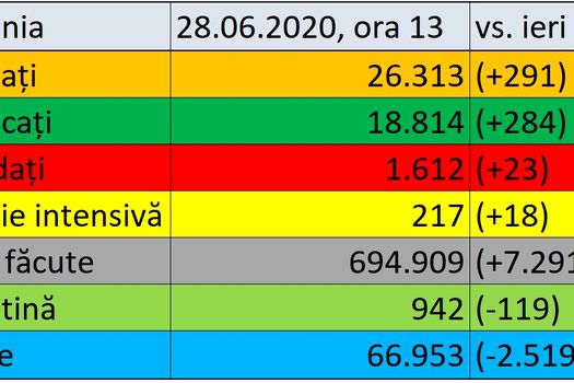 Până duminică, 28 iunie, pe teritoriul României, au fost confirmate 26.313 cazuri de persoane infectate cu noul coronavirus (COVID – 19). Dintre persoanele confirmate pozitiv, 18.814 au fost declarate vindecate şi externate.