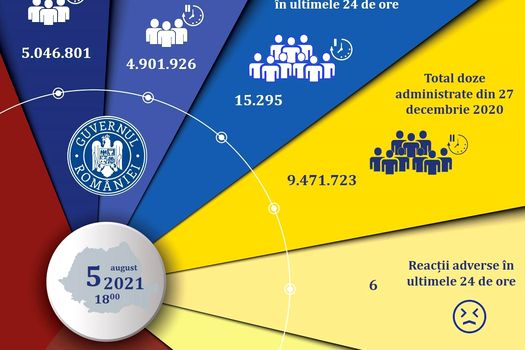 De la începutul campaniei, în România au fost vaccinate 5.046.801 persoane, din care 4.901.926 cu ambele doze.