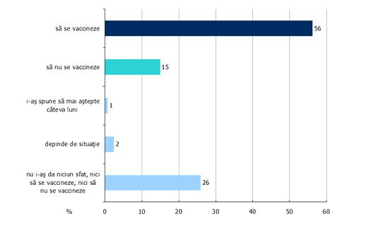 Dacă ar avea posibilitatea, ceva mai mult de jumătate (56%) din cetăţeni ar recomanda unei persoane apropiate să se vaccineze împotriva noului coronavirus. Categoriile de populaţie cele mai favorabile vaccinării sunt vârstnicii (67%) şi persoanele cu studii superioare (67%).