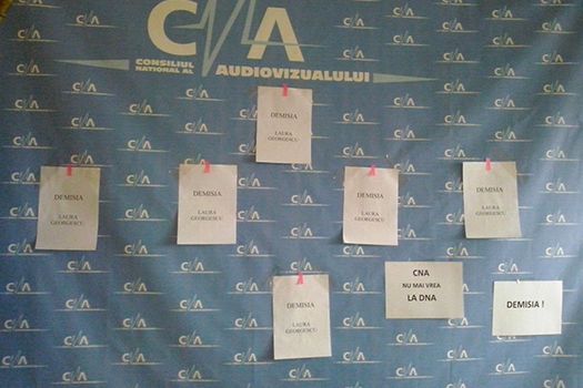 De asemenea, pe holul din faţa sălii de Consiliu şi pe uşa sălii sunt lipite coli cu mesaje precum „Demisia, Laura Georgescu”, „CNA nu mai vrea la DNA” şi „Părinţi: Daţi şansa de a putea fi mândri de voi!”. Pe o masă se strâng şi semnături ale angajaţilor Consiliului, care cer demisia Laurei Georgescu. Până în momentul difuzării acestei ştiri, 22 de angajaţi, dintre cei peste 130 ai CNA, şi patru membri ai Consiliului (Florin Gabrea, Răsvan Popescu, Valentin Jucan şi Dorina Rusu), din cei 11 actuali, au semnat pentru demisia Laurei Georgescu.