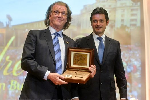 André Rieu a primit, vineri, titlul de ambasador onorific al Bucureştiului din partea primarului interimar al Capitalei, Răzvan Sava, celebrul violonist declarând că, la 66 de ani, s-a îndrăgostit din nou, de poporul român.