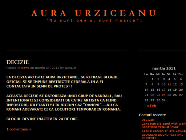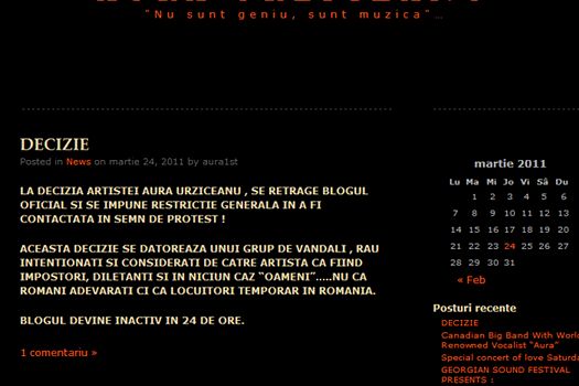 „La decizia artistei Aura Urziceanu, se retrage atât blogul oficial cât şi profilul de Facebook şi se impune restricţie generală în a fi contactată în semn de protest! Această decizie se datorează unui grup de vandali, rău intenţionaţi şi consideraţi de către artistă ca fiind impostori, diletanţi şi în niciun caz „oameni”…..nu ca români adevăraţi ci ca locuitori temporar în România”.