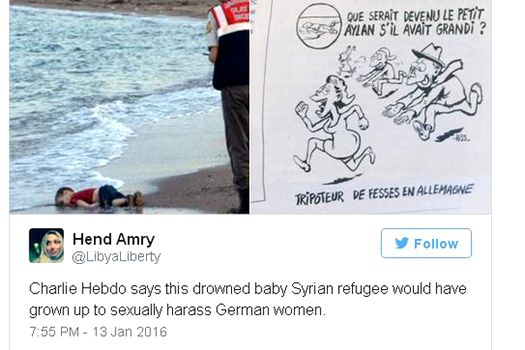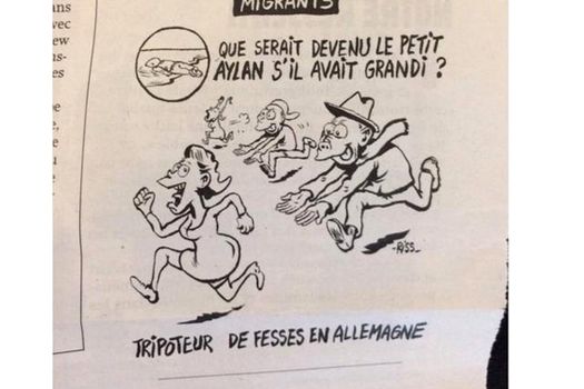 Caricatura apărută în paginile publicaţiei franceze este însoţită de textul: „Ce ar fi devenit Aylan dacă ar fi crescut? Un agresor sexual în Germania”.