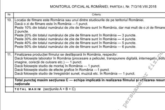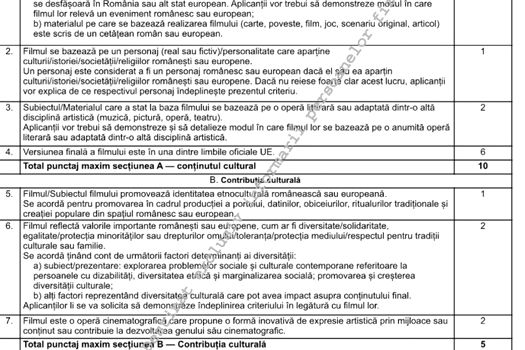 Potrivit documentului, un film, o operă audiovizuală pot fi încadrate ca „produs cultural” pentru a beneficia de ajutorul de stat pe baza unui test de eligibilitate la care trebuie să obţină minimum 18 puncte.