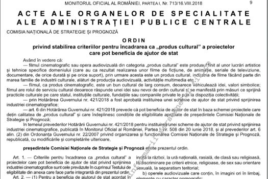 Comisia Naţională de Strategie şi Prognoză (CNSP) a publicat în Monitorul Oficial din 16 august un Ordin privind stabilirea criteriilor pentru încadrarea ca „produs cultural” a proiectelor care pot beneficia de ajutor de stat.