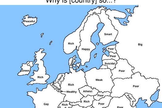 O hartă publicată pe site-urile businessinsider.com şi theatlantic.com compilează trăsăturile sugerate de Google pentru fiecare ţară din Europa. Sunt şi rezultate care surprind, cum ar fi „slabă” pentru Polonia sau „suicidală” pentru Lituania.