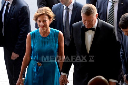 Preşedintele a venit împreună cu soţia sa, care purta o rochie lungă, de culoare turcoaz.