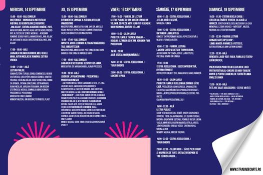 Lansările de carte aduc în atenţia cititorilor volume precum: Bunicul meu, Regele Mihai (Editura Vremea) de Nicolae de România, Secrets of Transylvania (lansat la ICR Londra), Monografia Institutului Naţional de Gerontologie şi Geriartrie „Ana Aslan” (editura Academiei Române), François Villon (editura Tracus Arte), Creaţia interpretativă şi factorul ludic, alături de Sfere sculptate (editura Grafoart). Prezentarea cărţii Cip şi cirip – Lumea magică a mamei şi a fetiţei ei (Curtea Veche Publishing) incită deoarece este un volum scris la două mâini, de Veronica& Ann-Kathrin Schmidt. Proiectul născut din spuma mărilor web şi din incertitudinile şi spaimele (i)realităţii, un proiect marca Dan Mircea Cipariu, sondează relaţiile noastre cu noile tehnologii, Inteligenţa Artificială, reţelele virtuale şi lumile extraterestre, materializat în volumul META VERS, publicat la Vellant şi ilustrat cu 7 desene de Mihai Zgondoiu. Puteţi face imersie în acest multivers vineri, 16 septembrie 2022, la ora 17, în Foaierul de Lectură.
