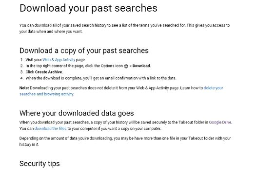 Motorul de căutare Google le permite utilizatorilor săi înregistraţi (care au un cont Google) să descarce pe computerul personal o copie a istoricului căutărilor efectuate în trecut sau să şteargă aceste date de pe serverele sale, potrivit gizmodo.com.