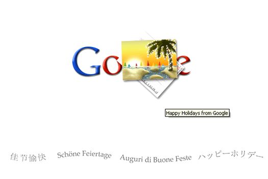Logoul păstrează doar primele două litere şi ultima, la mijloc fiind adăugată o carte poştală cu un soare, o oază de apă şi un palmier, stilizate astfel încât, în ansamblu, imaginea să redea cuvântul „Google„.