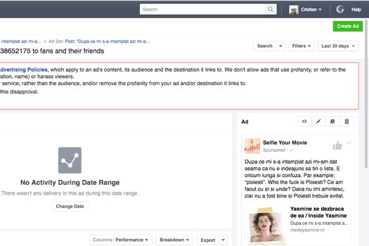 Mesajul Facebook prin care reţeaua de socializare a cenzurat Jurnalul lui Yasmine este: „Your ad wasn’t approved because it doesn’t follow our Advertising Policies, which apply to an ad’s content, its audience and the destination it links to. We don’t allow ads that use profanity, or refer to the viewer’s attributes (ex: race, ethnicity, age, sexual orientation, name) or harass viewers.How to fix: We recommend focusing on your product or service, rather than the audience, and/or remove the profanity from your ad and/or destination it links to. If you think your ad follows our policies, you can appeal this disapproval.”