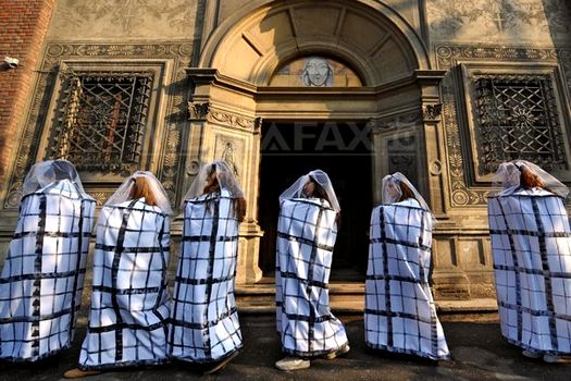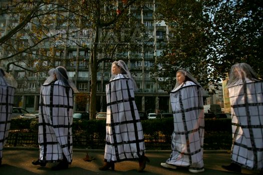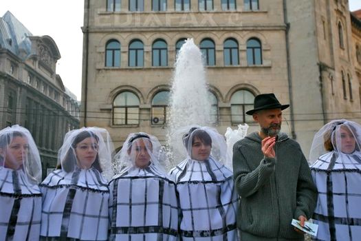 Cele 50 de fete, studente la sociologie în cadrul Universităţii Bucureşti, purtau fiecare câte o pânză albă de la gât până la pământ, pe care erau pictate cu negru nişte gratii, şi câte un mic voal de mireasă pe cap.