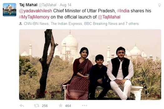 După lansarea contului oficial al Taj Mahal, şeful guvernului din Uttar Pradesh a distribuit o fotografie cu soţia şi fiul său în faţa mausoleului.