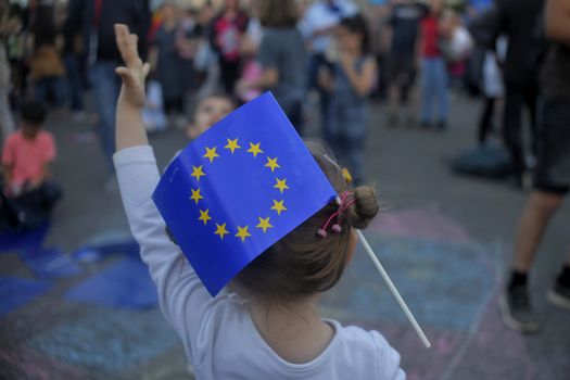1. O fetita, care are prins in par un steag al Uniunii Europene, se joaca in timpul evenimentului ”Toti pentru Europa”, organizat de comunitatea Declic, in Piata Victoriei din Bucuresti, duminica, 19 mai 2019. ANDREEA ALEXANDRU / MEDIAFAX FOTO