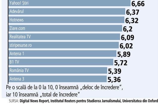 În topul brandurilor cu cea mai mare încredere sunt incluse 15 publicaţii, printre care agenţia de presă Mediafax (locul al patrulea – 7,63), Pro TV (locul al cincilea – 7,62), Yahoo Ştiri, Adevărul sau Hotnews.
