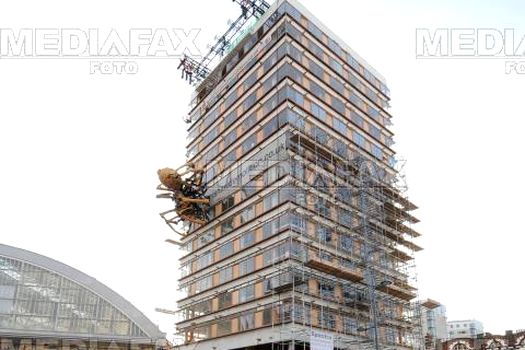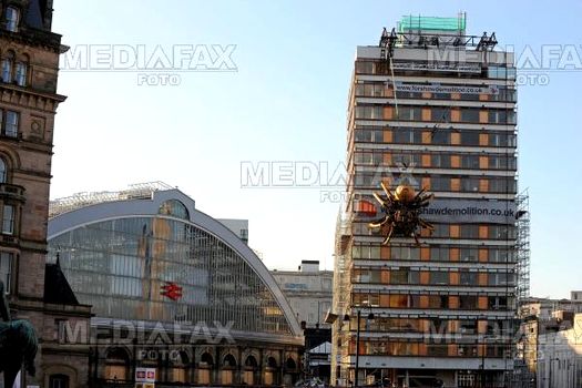 Păianjenul va rămâne suspendat de un turn din centrul oraşului Liverpool, care urmează să fie demolat, până duminică.