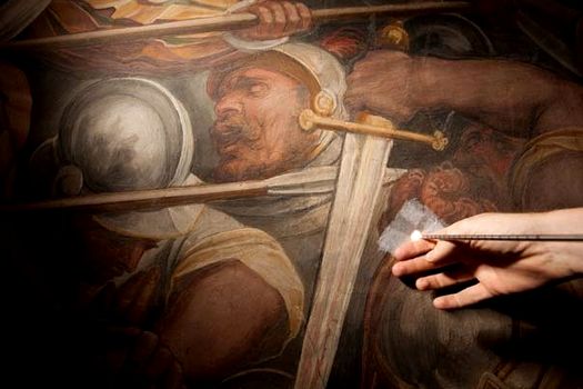 Savanţii italieni au descoperit şi un strat de lac roşu şi o vopsea maro pe un zid vechi, ascuns sub un altul, pe care Vasari a pictat acea frescă.