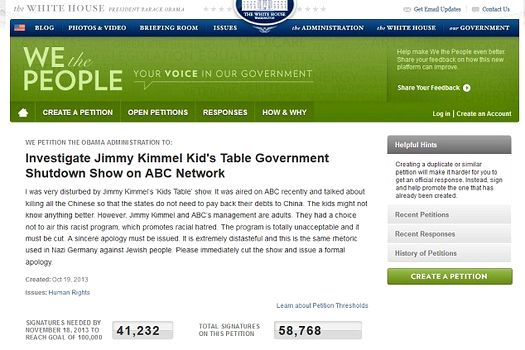 O organizaţie politică asiatico-americană, numită 80-20, a iniţiat o petiţie prin care preşedintele Barack Obama este rugat să investigheze cazul şi să închidă emisiunea difuzată de ABC. Pentru a ajunge la preşedinte, petiţia are nevoie de minimum 100.000 de semnături, iar până în prezent s-au strâns 60.000 de semnături.