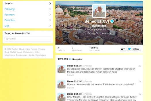 Pe 27 iunie 2011, papa Benedict al XVI-lea a postat un mesaj pe contul de Twitter al Sfântului Scaun, cu ocazia lansării site-ului www.news.va, primul portal multimedia al Vaticanului, redactat în mai multe limbi. Însă acel mesaj nu a fost postat de pe contul său personal.