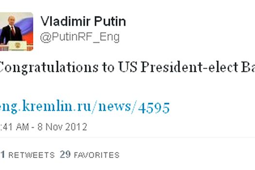 „Felicitări preşedintelui ales al Statelor Unite Barack Obama.” („Congratulations to US President-elect Barack Obama.”) a fost primul tweet publicat pe contul oficial în limba engleză a lui Putin, @PutinRF_Eng, care datează din 8 noiembrie 2012.