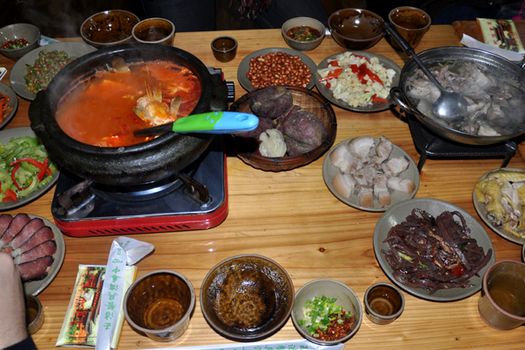 Pe masa lungă, tradiţională etniei Miao, fierb, bolboresesc şi stau cuminţi în vase de pământ sau direct pe plite sub care arde focul, bucate a căror identitate poţi doar să o bănuieşti. Iar, dacă străbaţi drumul pe jos, tăind satul de la sud la nord şi apuci să vezi că pe tarabele comercianţilor zac, în cantităţi uriaşe, broaşte, fazani uscaţi cu trei pene lăsate în coadă, pentru autenticitate, cel mai probabil, dar şi crustacee şi cârnaţi uscaţi şi cam diformi, parcă nu îţi vine să întinzi mâna să duci ceva la gură. Mai bine bei, pentru că, şi în China, băutura leagă prietenii, dezleagă limbi şi deschide perspective.